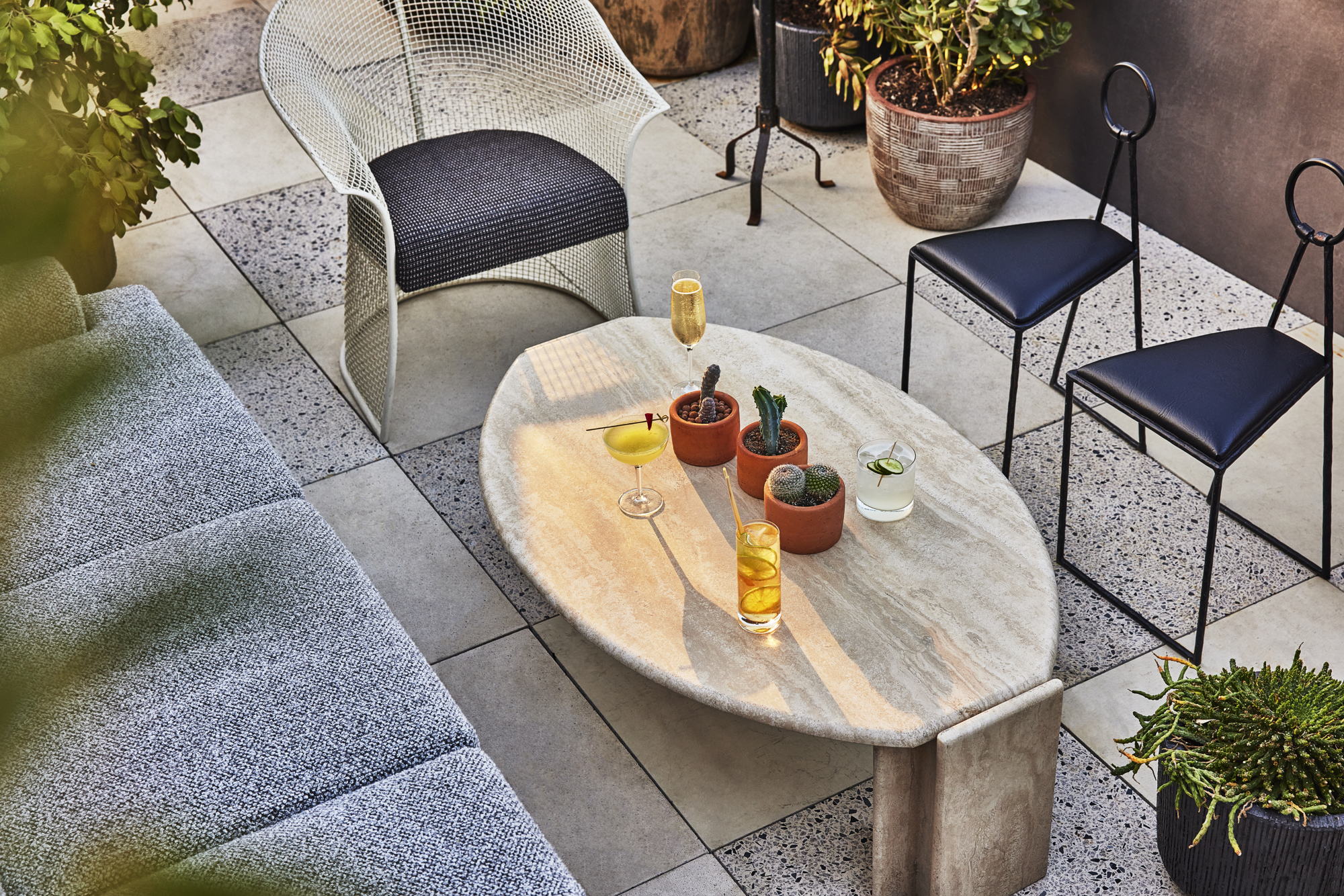 The extraordinarily-personalised hotel suites gather stone mosaic coffee tables and artisanal carved wooden chairs intermixed with warm metal fixtures, hardwood floors, and tactile textiles in an array of patterns. Speaking to the international influences of the surrounding area, Wearstler brings together wooden chairs and lamps sourced from France, handcrafted Turkish rugs, alongside bespoke ceramic designs by Peck. The bathrooms showcase a fusion of hand-painted vintage and custom tiles in dynamic dialogue with lavish marble vanities, lustrous metal lighting, and geometric mirrors.